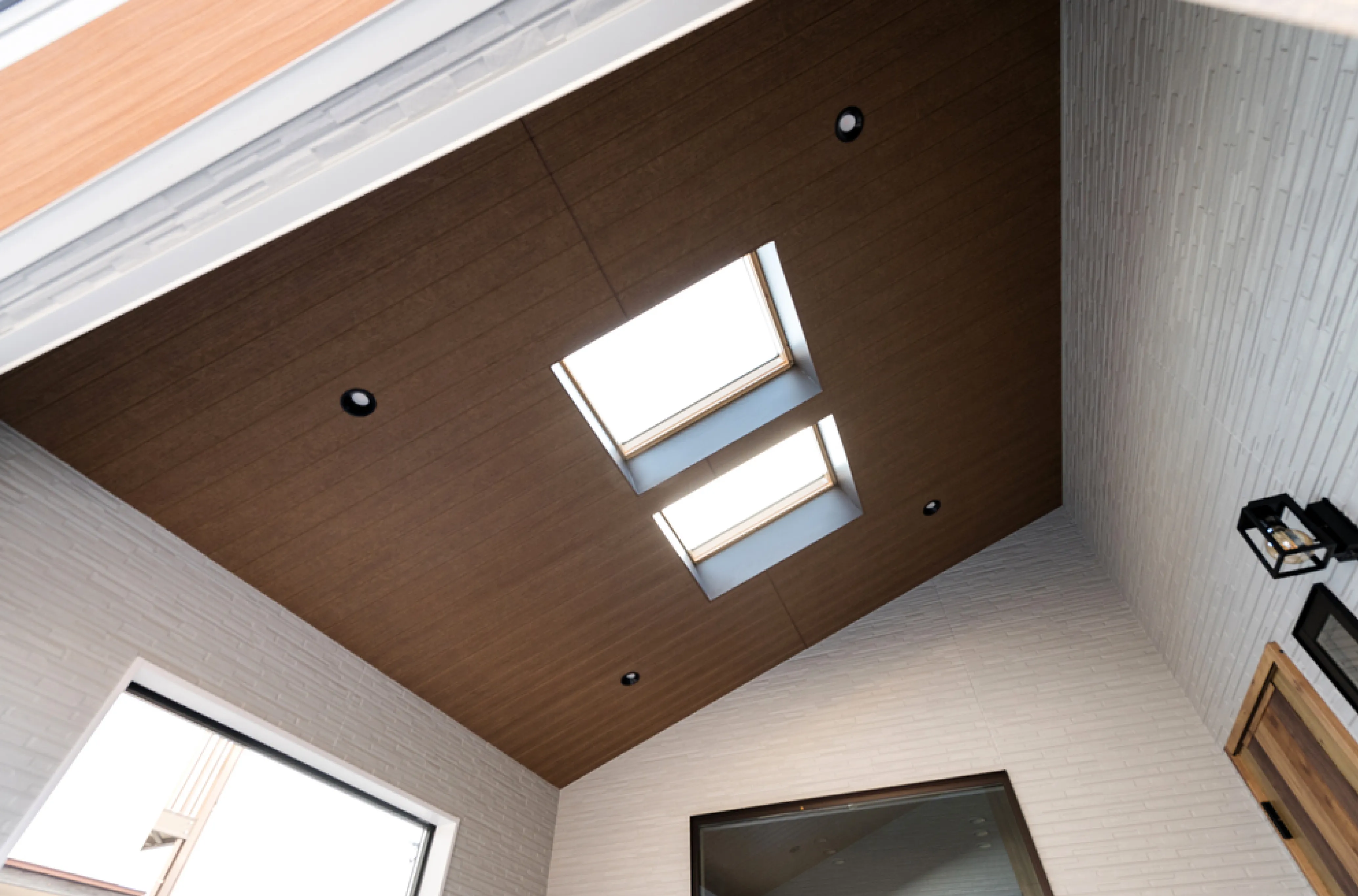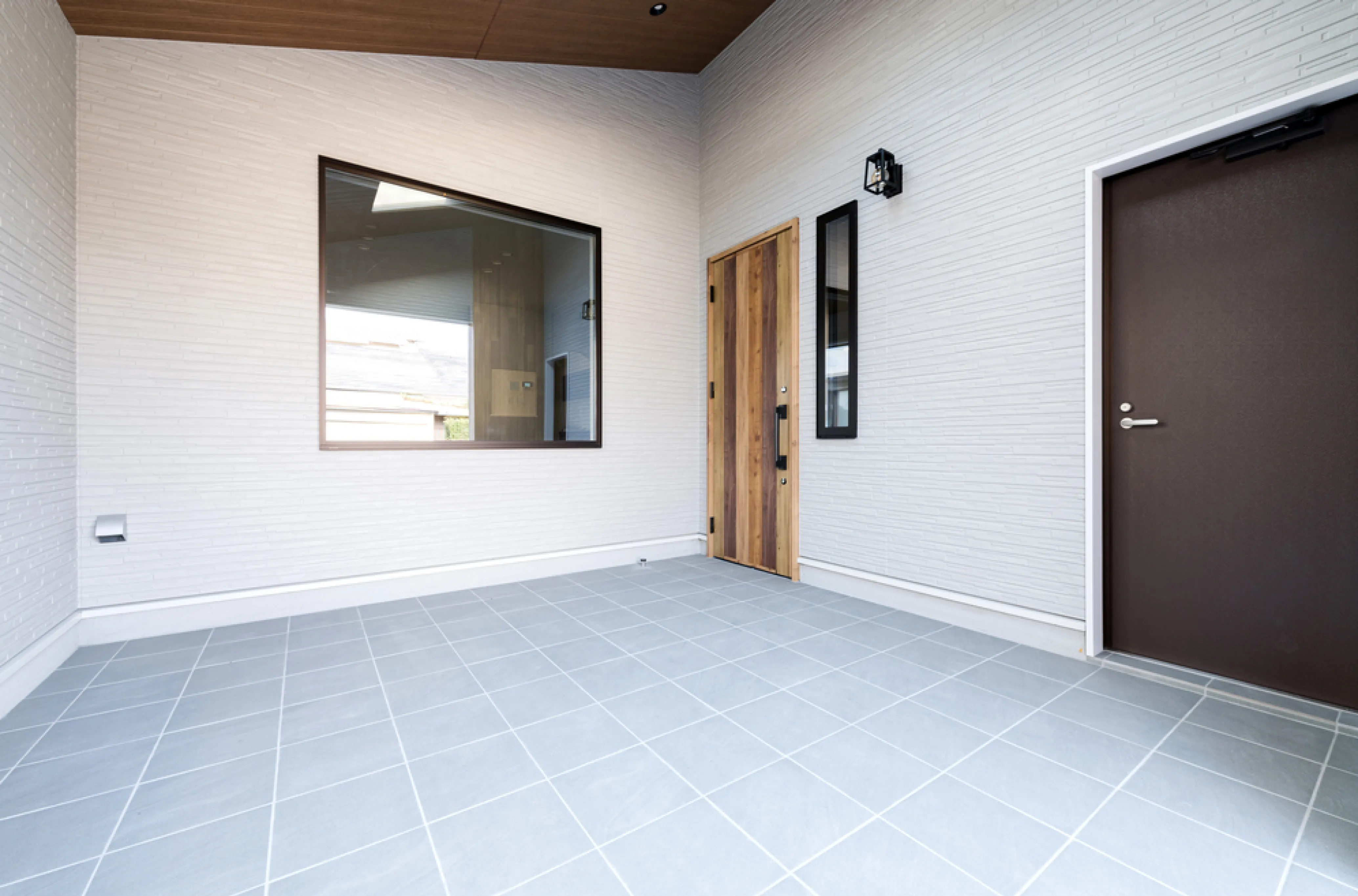 広々としたエントランスは、「NIHON NOIE PROJECT by SOU・SOU」の通り庭をイメージしたこだわりのデザイン。屋根には天窓を設け、光が降り注ぐ明るい空間になっています。また、リビングとは大きな窓でつながっており、お子さまたちがプール遊びをしている姿を、室内から見守ることもできます。これも奥さまのリクエストで実現したポイントの一つです。