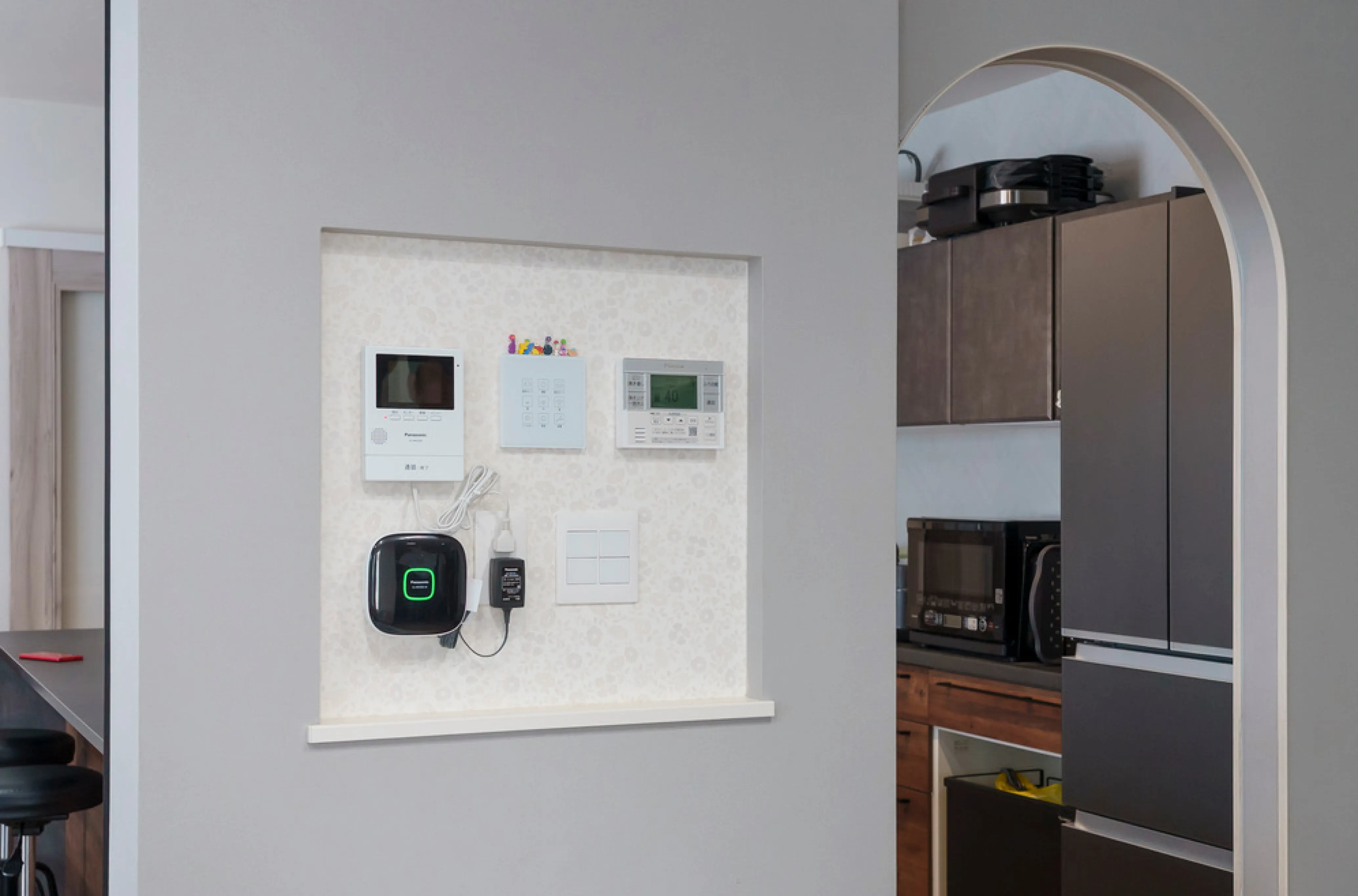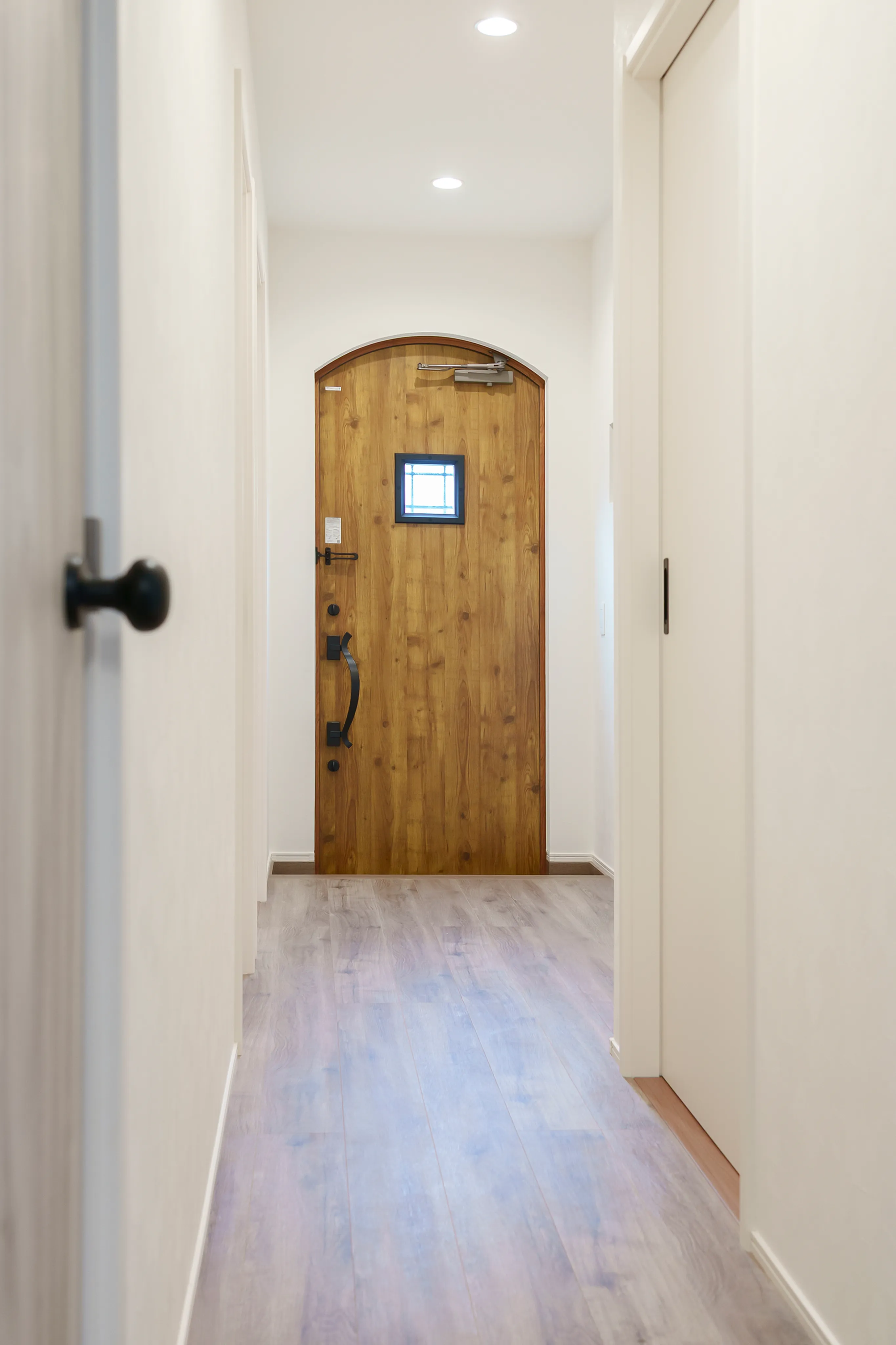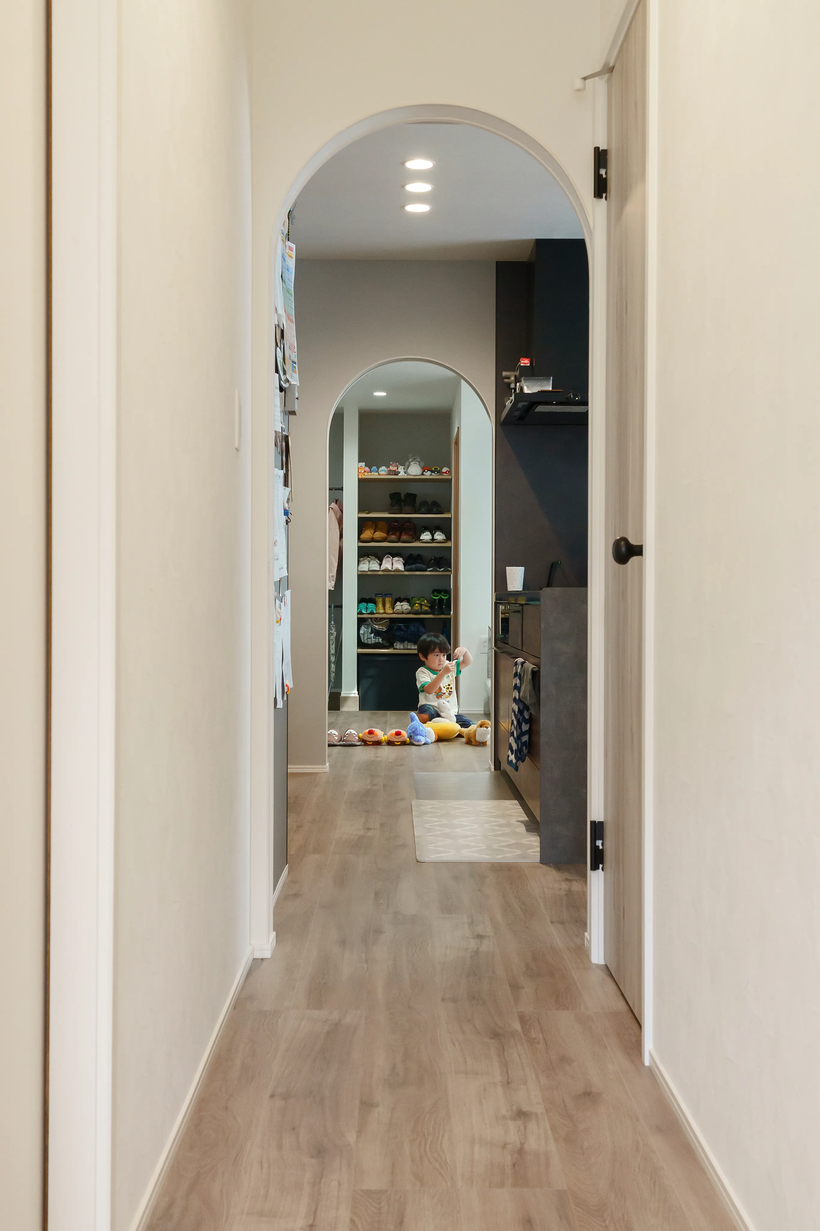 Oさま邸にはエントランスからつながる玄関のほかに、実はもう一つ玄関があります。これは奥さまがどうしても諦めきれなかった木目の扉を、家の一番奥に設置したもの。さらに、ドアのアーチ型を内装デザインにも活かし、二つの玄関をつなぐ通路を全てアーチ型で統一しました。遊び心と上質さを兼ね備えたデザインは、住まい全体の雰囲気づくりにも一役買っています。