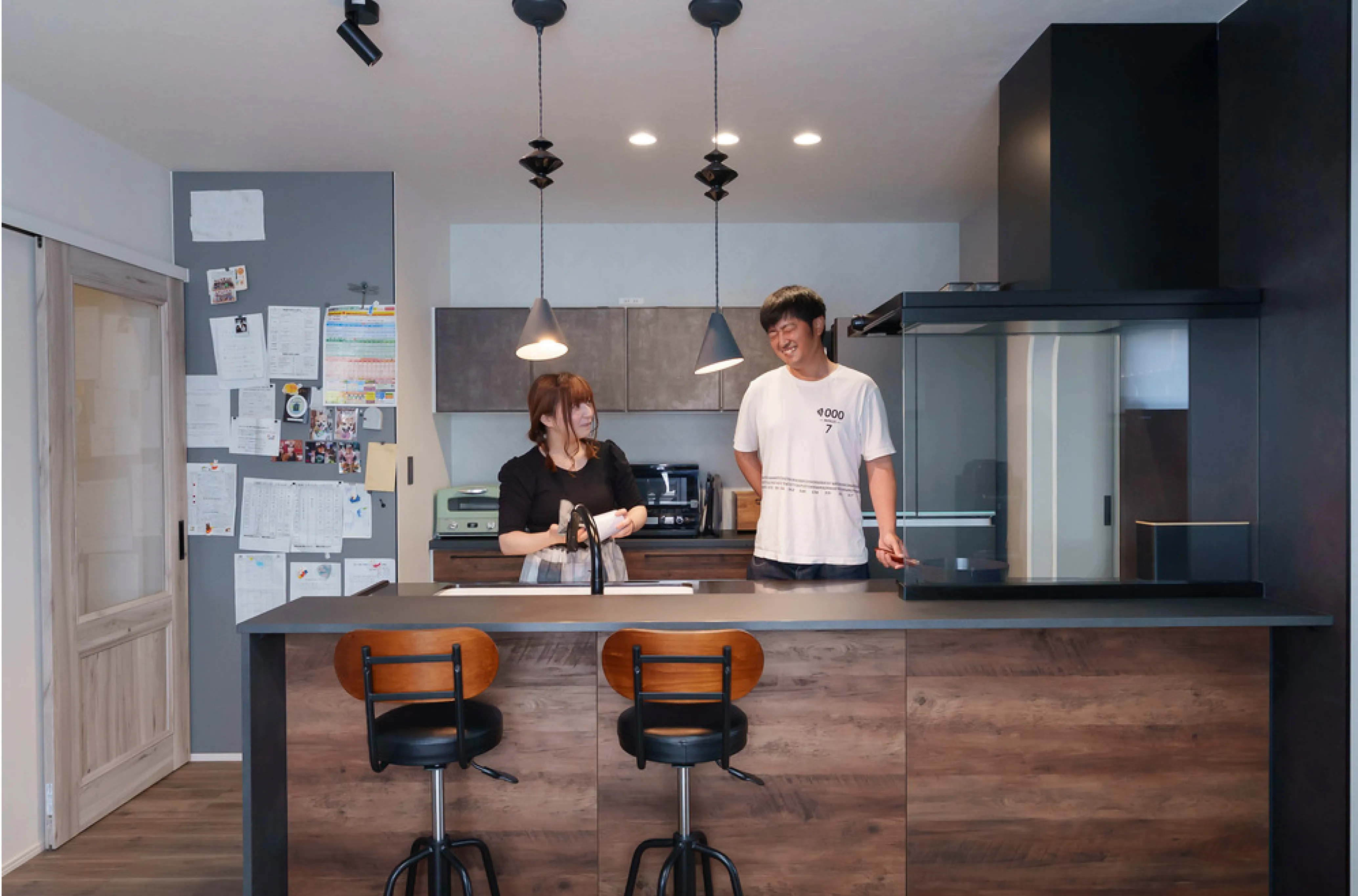 「黒と木目のシステムキッチンに一目惚れして、この色を基調にキッチンをコーディネートしました。とにかく広くて機能的で、我が家の主役ですね」と奥さまも惚れ惚れ。