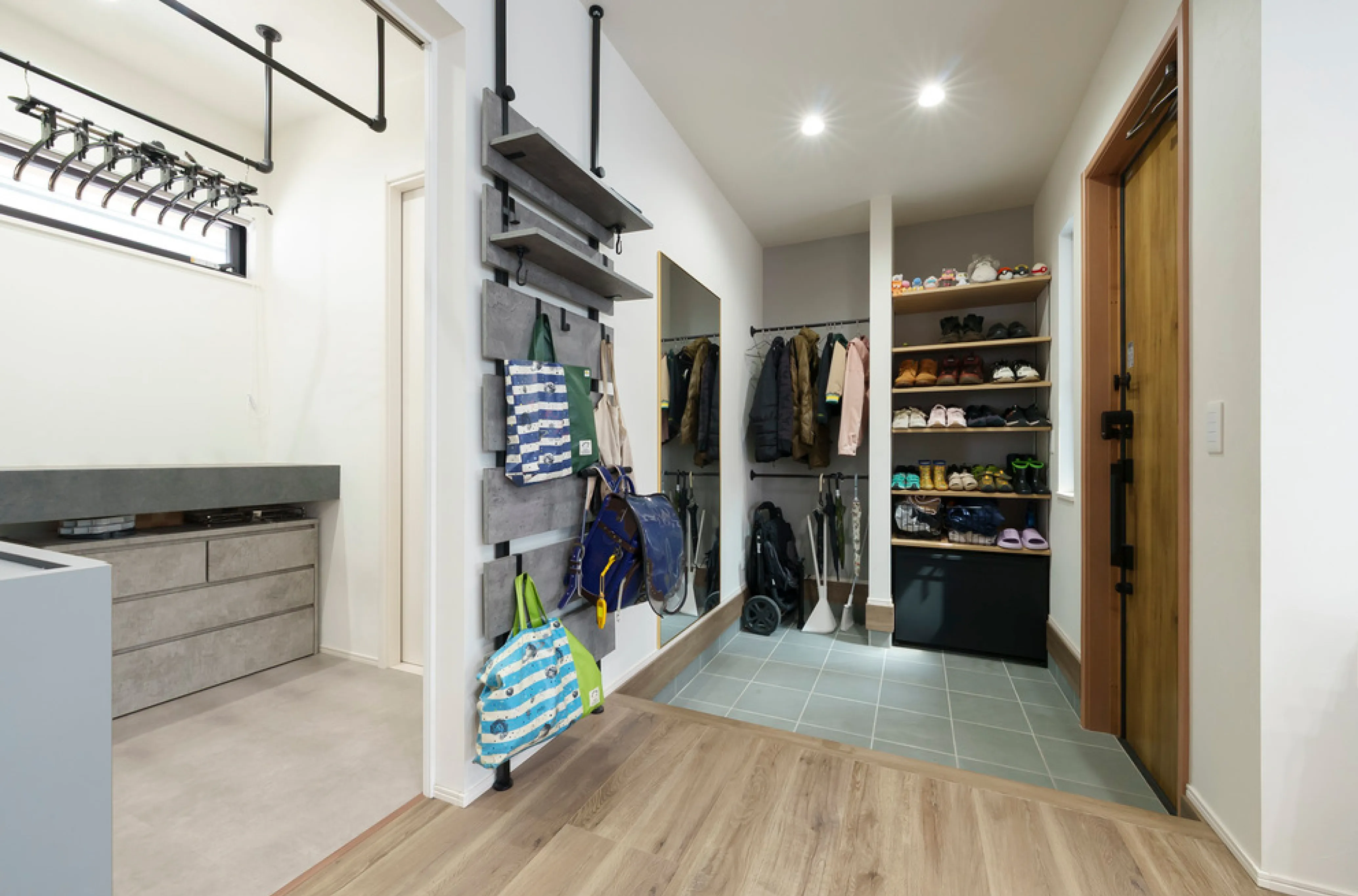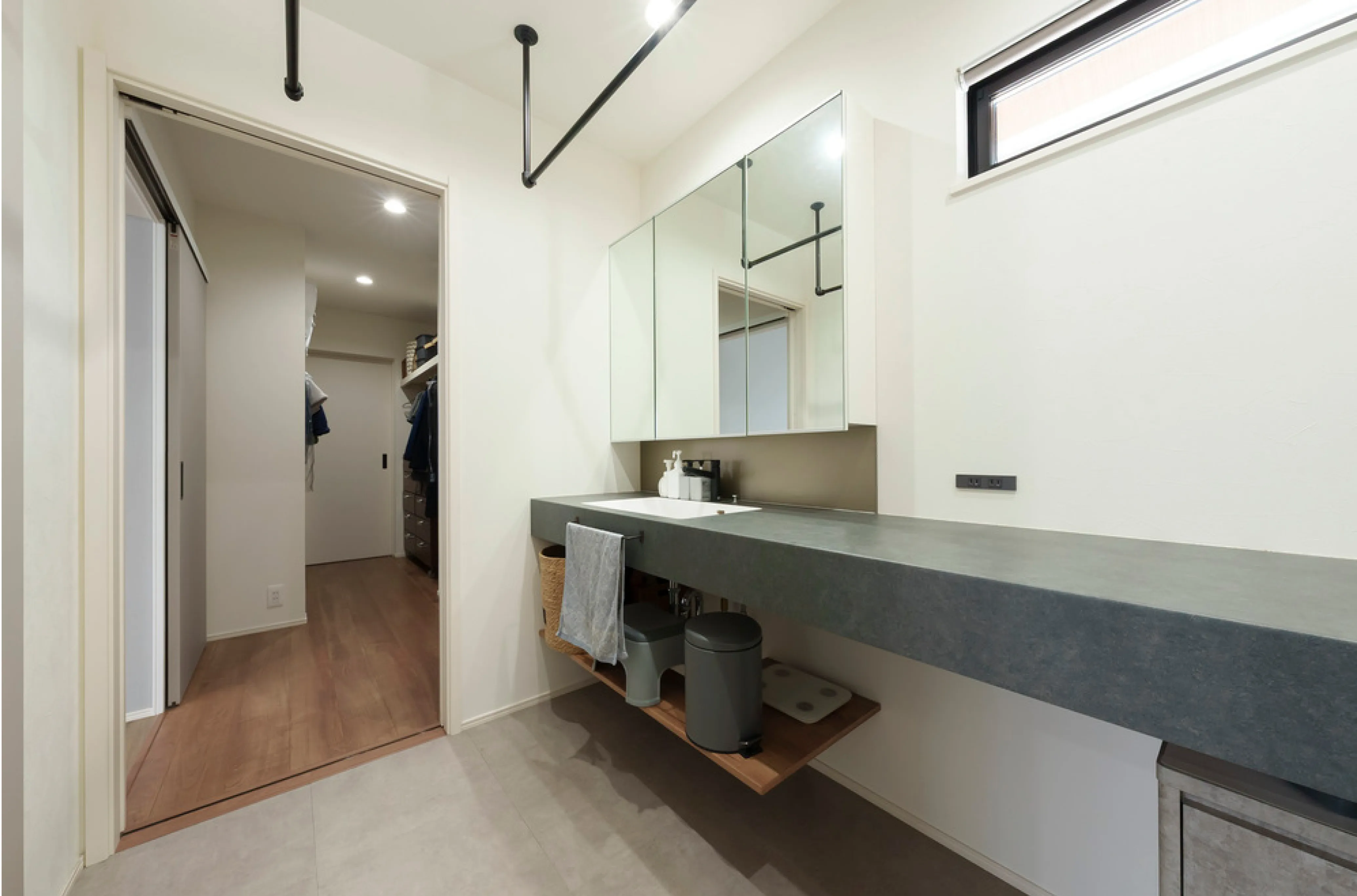 デザイン性にこだわった空間は、ランドリースペースにもあります。2m以上のワイドな造作カウンターは、洗濯物を畳んだり、アイロンをかけたりと大活躍。浴室から脱衣所、ランドリースペース、そしてファミリークローゼットへとつながる動線もスムーズで、日々の家事が効率的になりました。