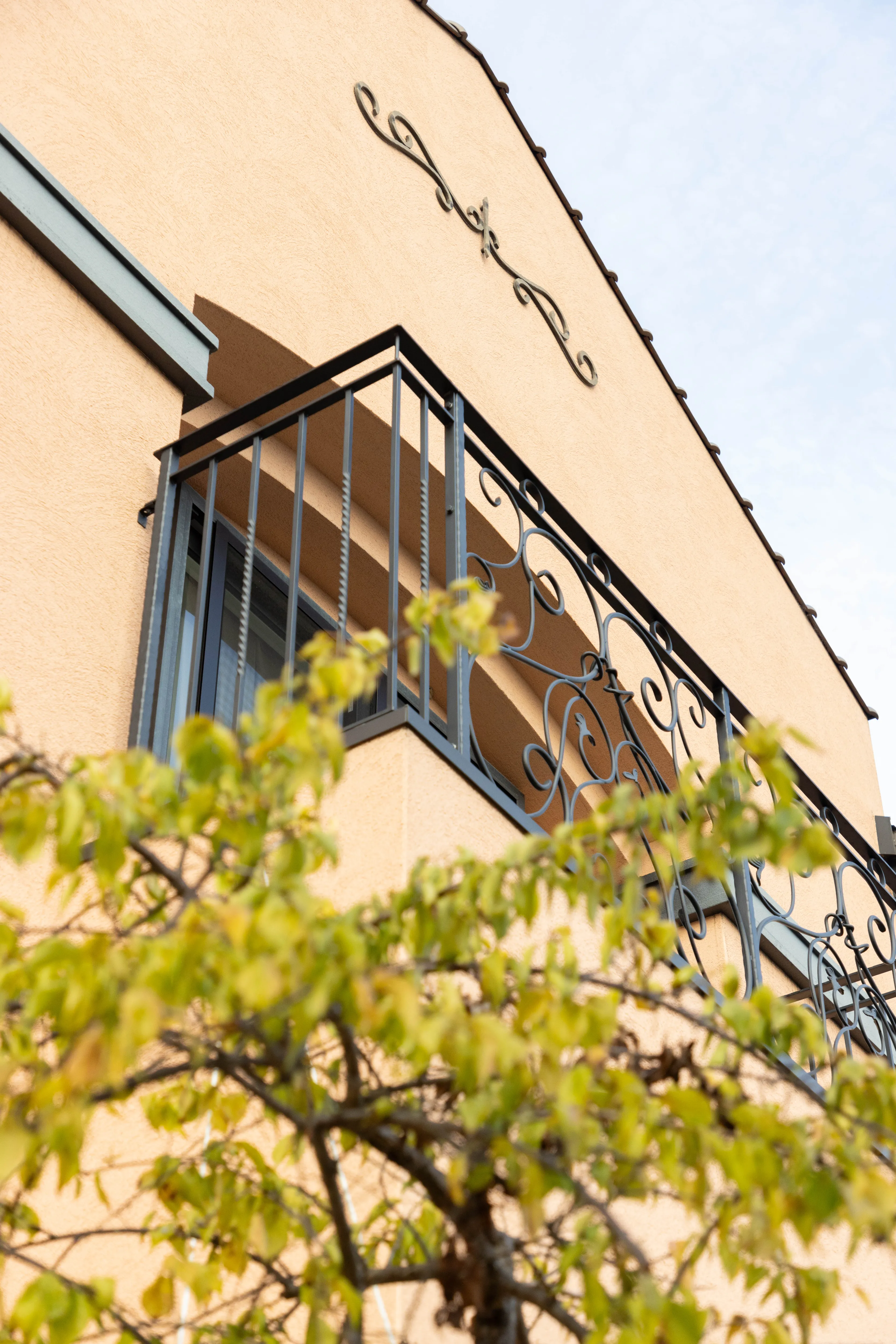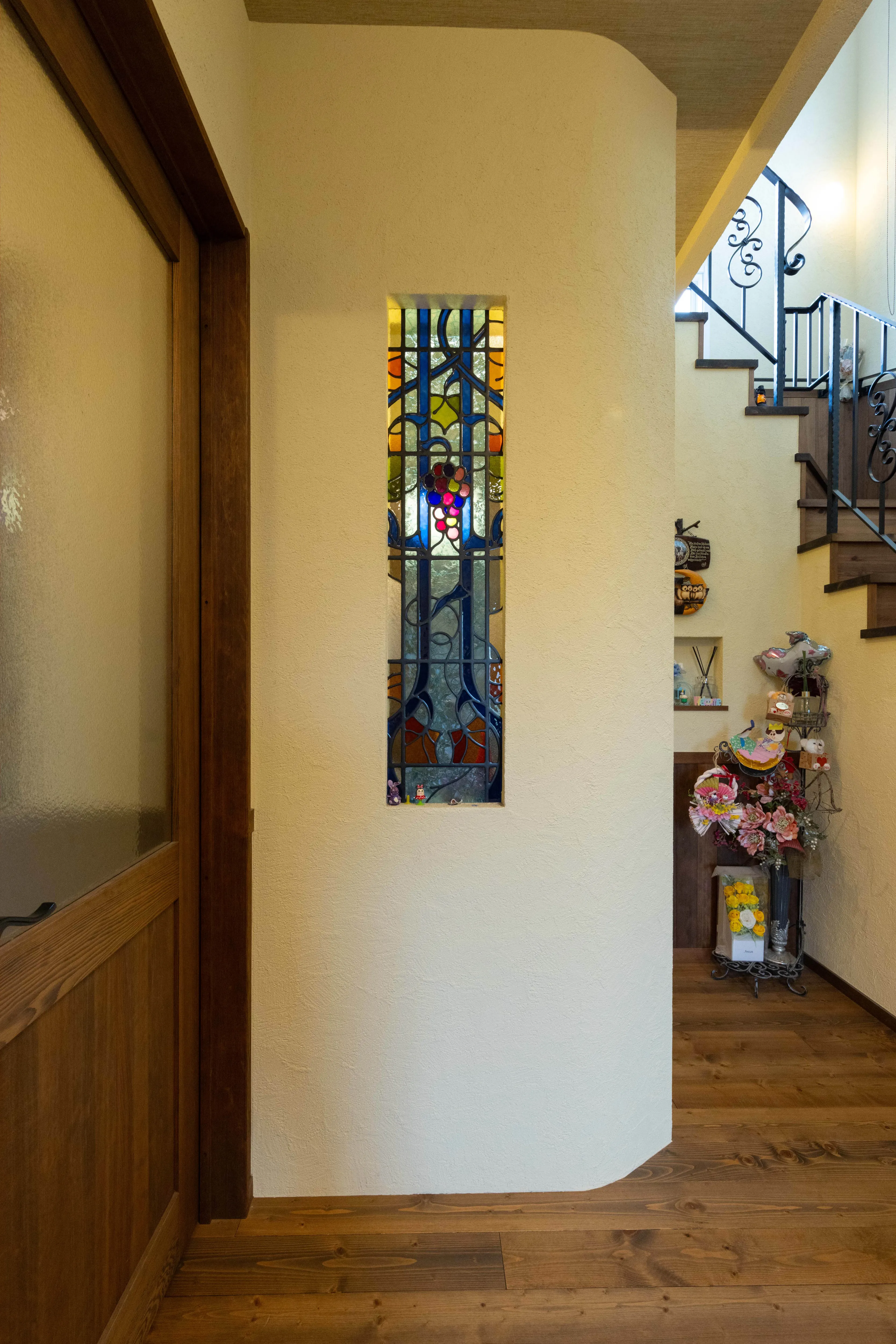 ステンドグラスが優雅に映える、柔らかな丸みを帯びたアール型の袖壁。表情を変える細やかな塗り壁やタイル張りのバルコニーなど、本物の素材にとことんこだわったOさま邸。