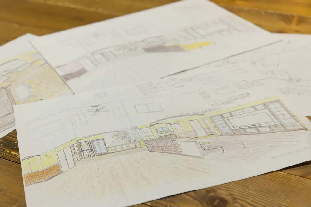 「イメージを可視化するために、外観パースから各部屋の展開図まで、すべて私が描きました」と旦那さま。大手住宅メーカーでの経験を活かし、本格的な図面が何ページにもわたって描かれた資料をもとに、設計士がその想いを丁寧に図面に落とし込みました。