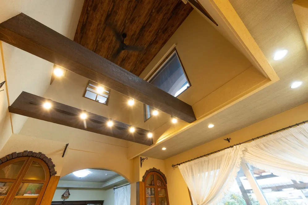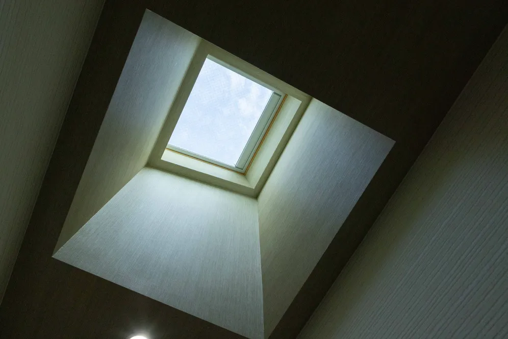 廊下やウォークインクローゼットなど光が届きにくい場所に天窓を設け、もともとバルコニーの予定だったダイニング上部を、大きなフィックス窓のある吹き抜けに変更しました。